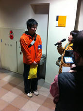 田中翔一郎さんがインタビューを受ける。